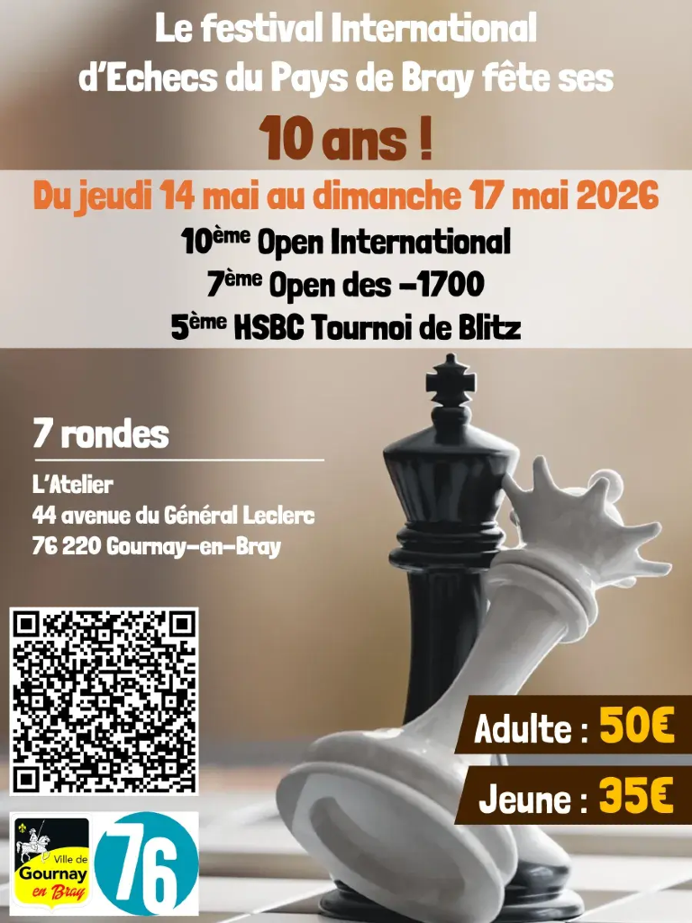 - Du 14 au 17 mai 2026 : 10ème open international d'échecs du Pays de Bray ! Un open principal + un open pour les moins de 1700 elo.